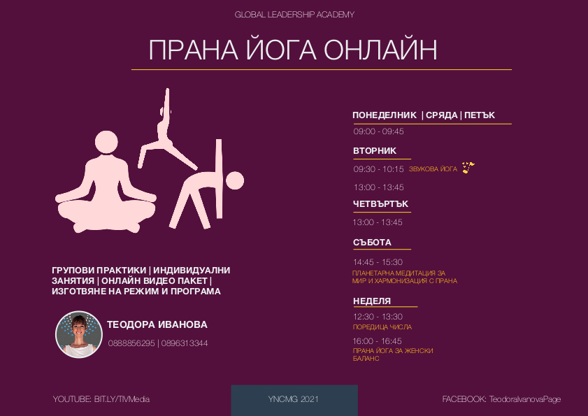 - Неделя: 16:00 – 16:45 – Прана йога за женски баланс;