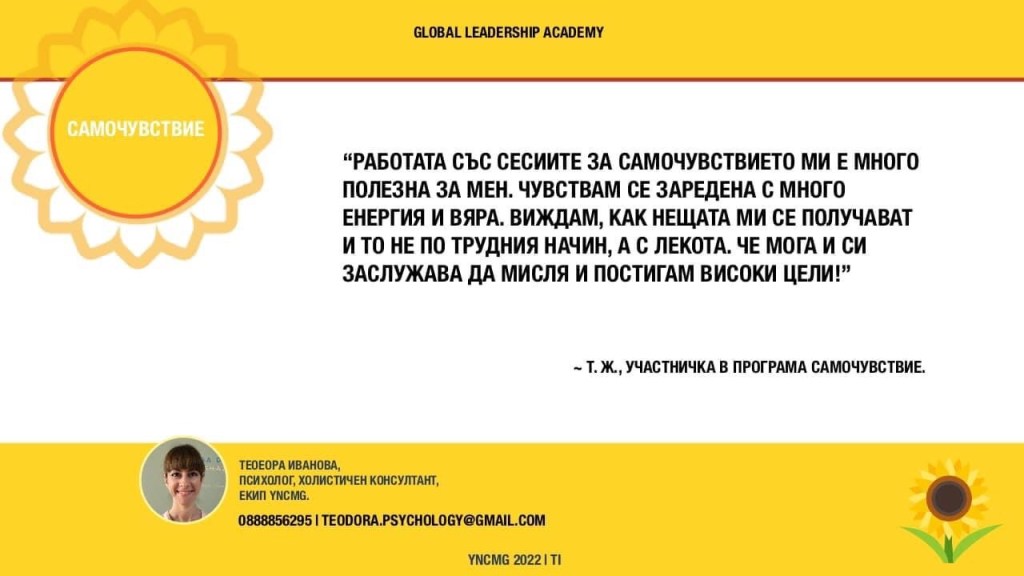 Аз съм Теодора Иванова, психолог, холистичен консултант, част от екипите на YNCMG.