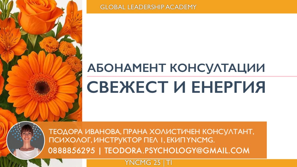 За информация и записване: 0888856295, Теодора Иванова, психолог, Прана холистичен консултант и обучител, екип YNCMG.
